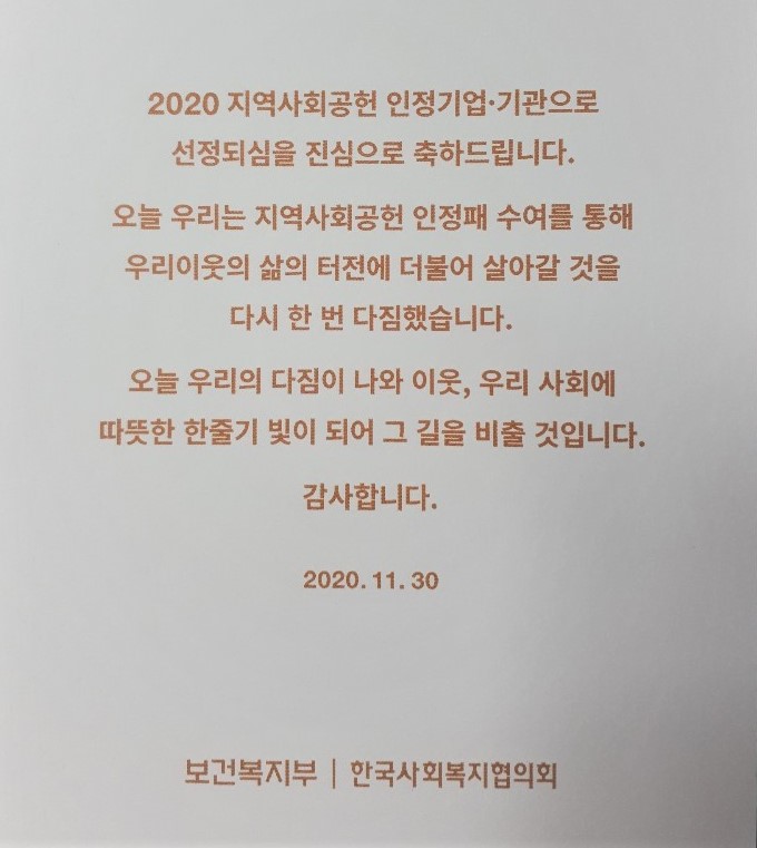 “2020 지역사회공헌 인정기업·기관”으로 선정되었습니다.