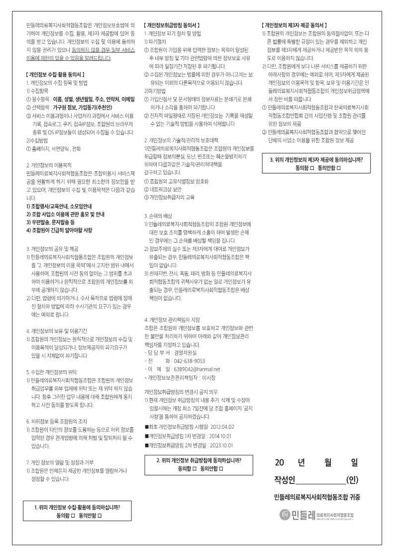 조합원 가입서 개인정보 수집•활용, 취급방침, 제3자 제공 동의서 변경 안내